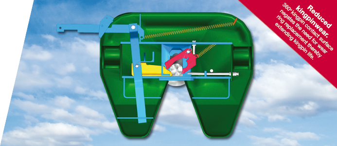 Het systeem is speciaal ontworpen om mis-koppeling te verminderen en daarmee de schade te beperken en een aanzienlijke verbetering van de veiligheid. Omdat de kingpen 360 graden wordt opgesloten door de vergrendeling is er sprake van zeer geringe slijtage bij zowel de kingpen, de vergrendeling en de schotel. Dit geeft de chauffeur veel meer comfort en een stabiel gevoel.